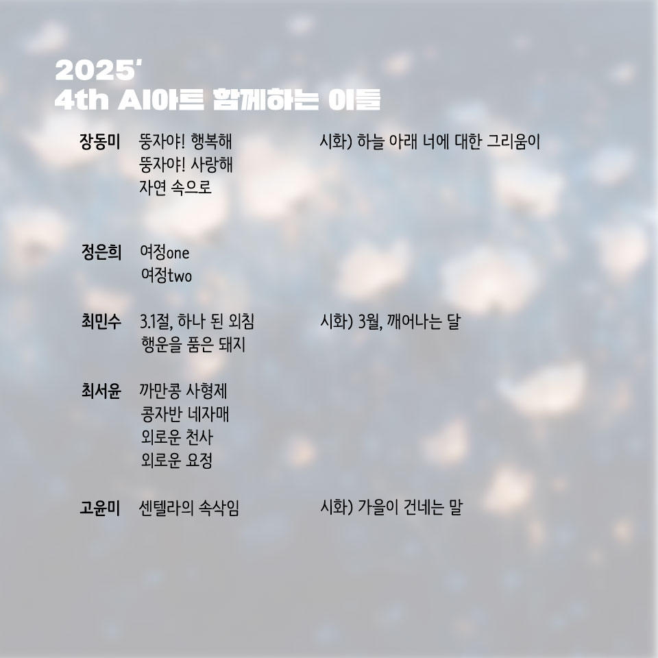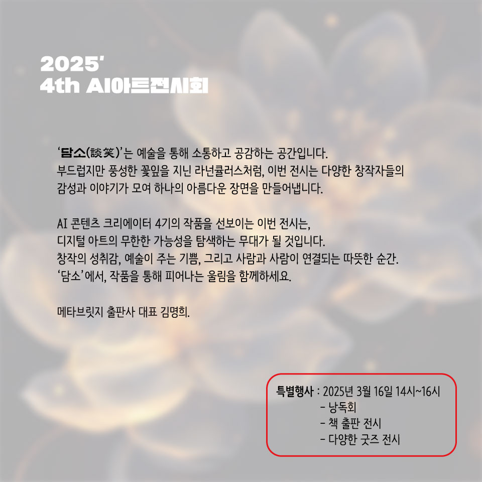 그림과 이야기, 그리고 소리가 하나로 어우러지는 공간에서 그들의 작품을 만나볼 수 있는 “2025 4th AI 아트 전시회”에서는 특별한 만남이 준비되어 있습니다.