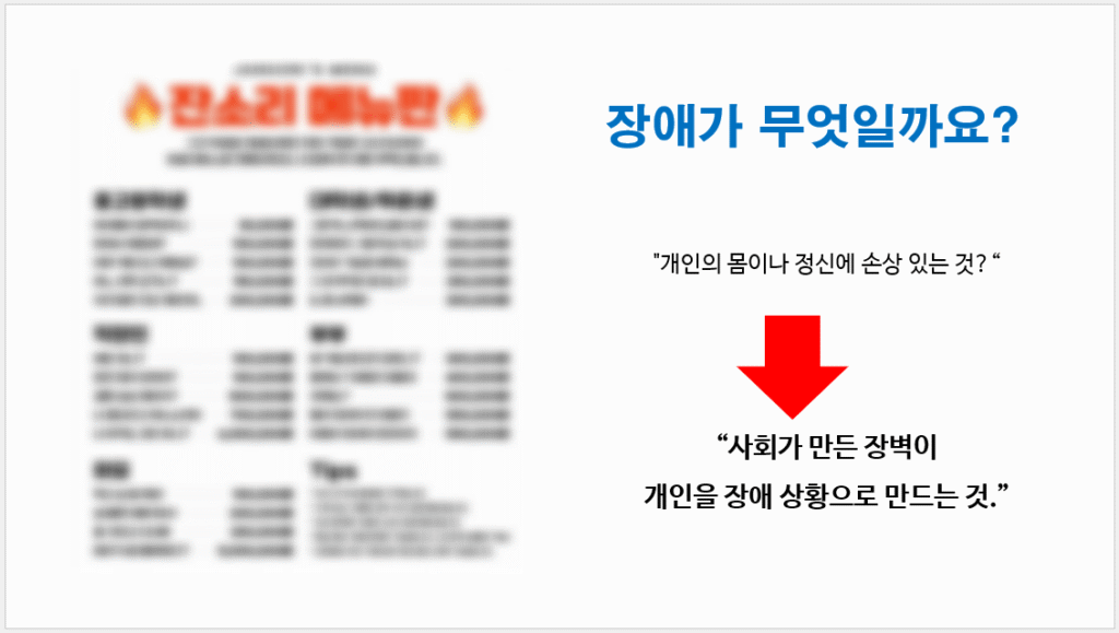 장애 상황은 사회가 만든다고 강조하고 싶었고